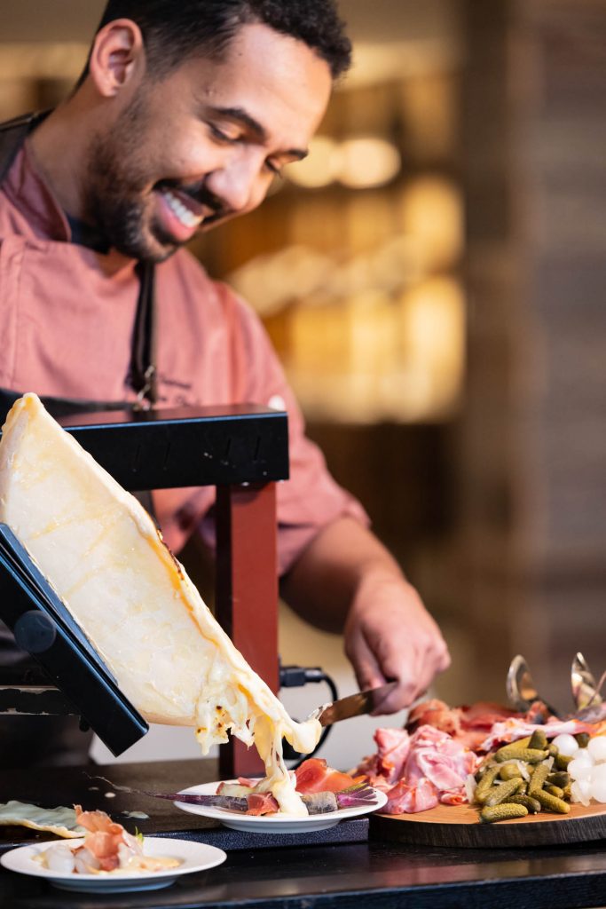 That’s why The Hythe Vail features its signature raclette experience on the menu. Raclette is a traditional Swiss dish from the Valais region in the Alps. The name comes from the French verb, racler, which means to scrape.