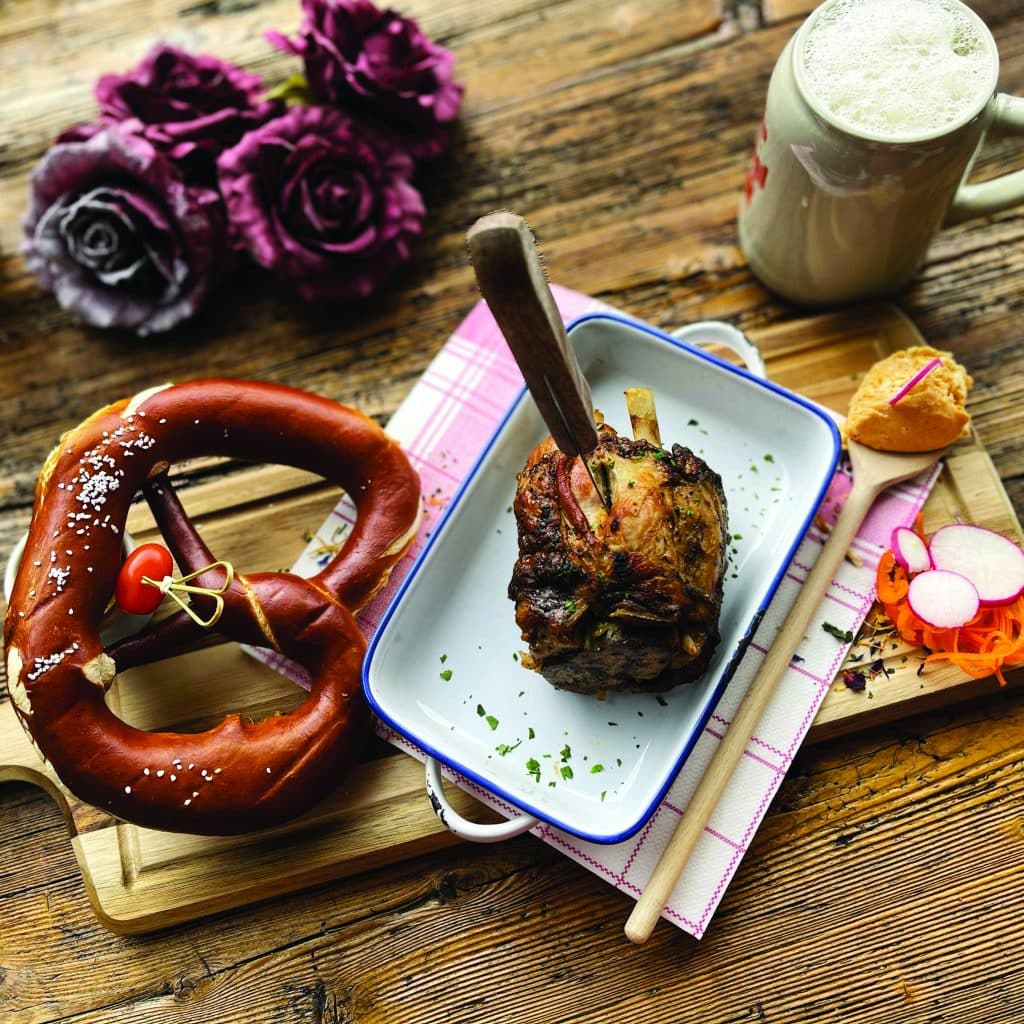 Soups become the perfect winter warmer when the snow stacks up outside. The beloved mountain climber soup —”Bergsteiger Suppe,” a beef stew with spätzle and Swiss cheese — is is joined by a hearty chili con carne for cold nights and a silky vegetarian pea soup. Salads get their own alpine spin, too. The red beet and feta salad layers peppery arugula with feta crumbles, walnuts and crisp apple slices, providing a bright counterpoint to what inevitably becomes an indulgent afternoon or evening.