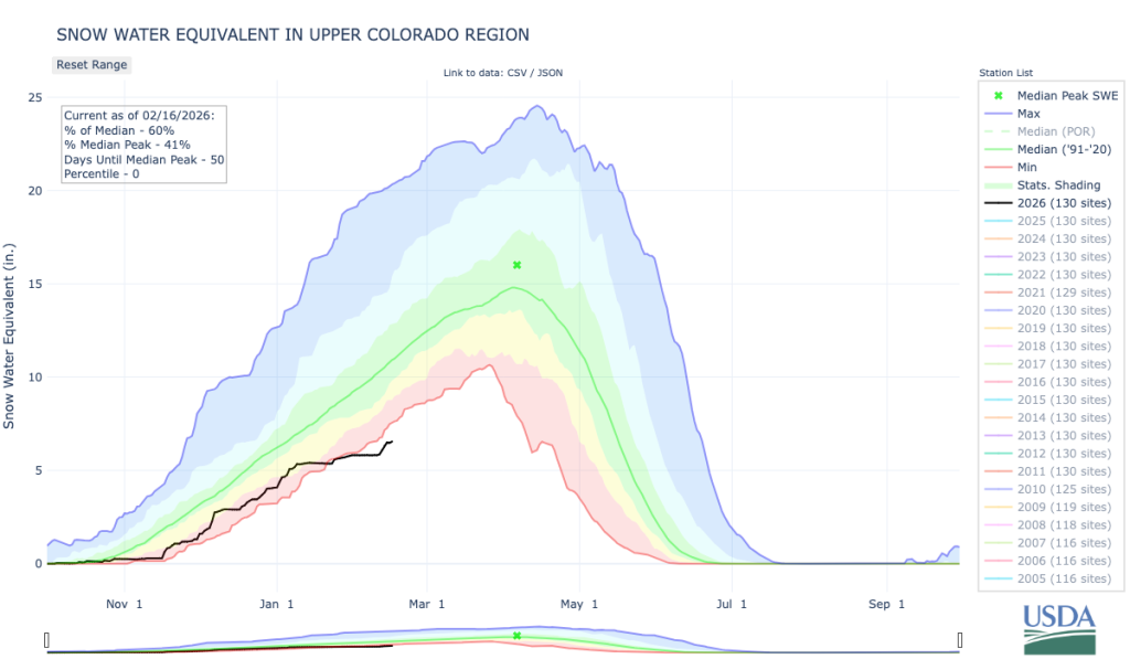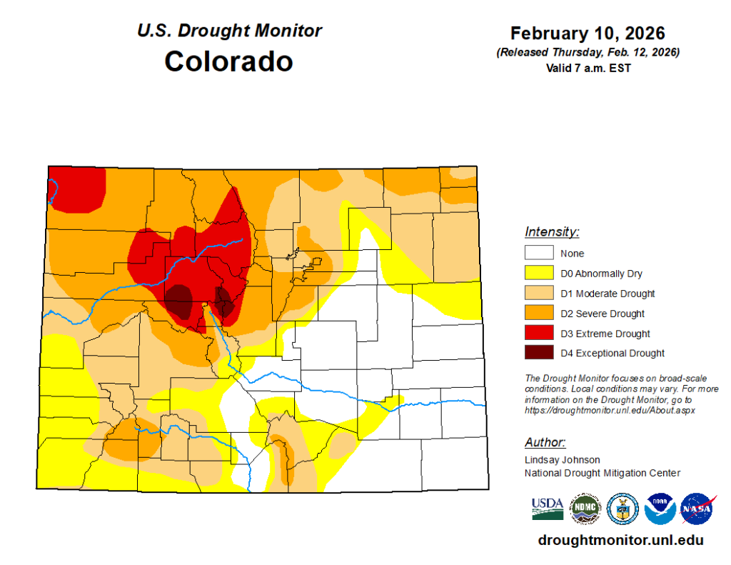 As Colorado experiences its worst snowpack in the last 30 years, drought conditions have worsened across the Western Slope. The latest Colorado Drought Monitor from the U.S. Department of Agriculture shows exceptional and extreme drought developing across the north-central mountain region. Snowpack within the Colorado River headwaters sits at 55% of normal as of Feb. 16.