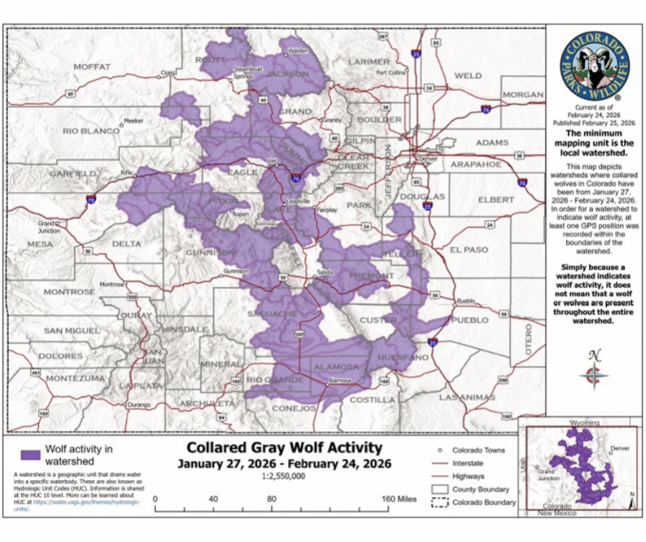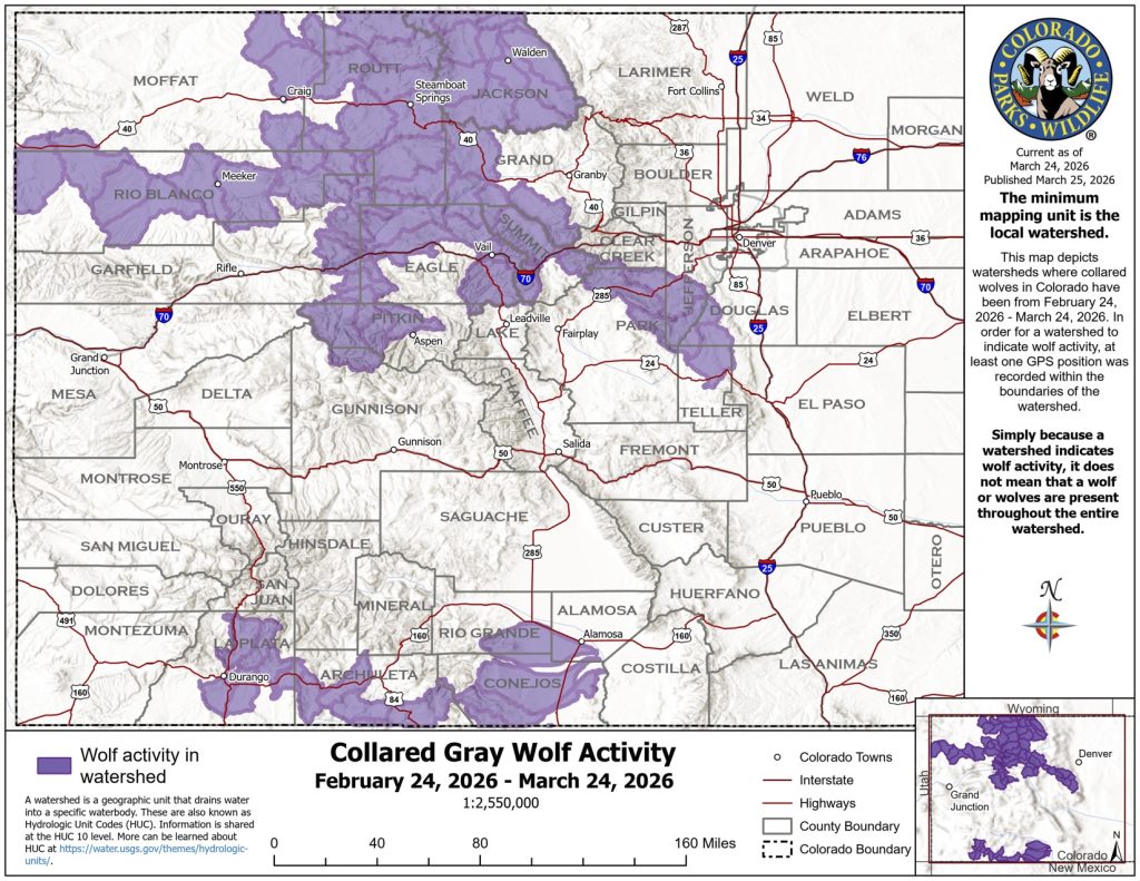 This is according to Colorado Parks and Wildlife’s latest wolf activity map, which shows the watersheds where the state’s collared wolves were located between Feb. 24 and March 24. Compared to the previous month, the activity appears to be isolated into the northernmost and southernmost regions of the Western Slope, with no movement highlighted through the middle of the state.