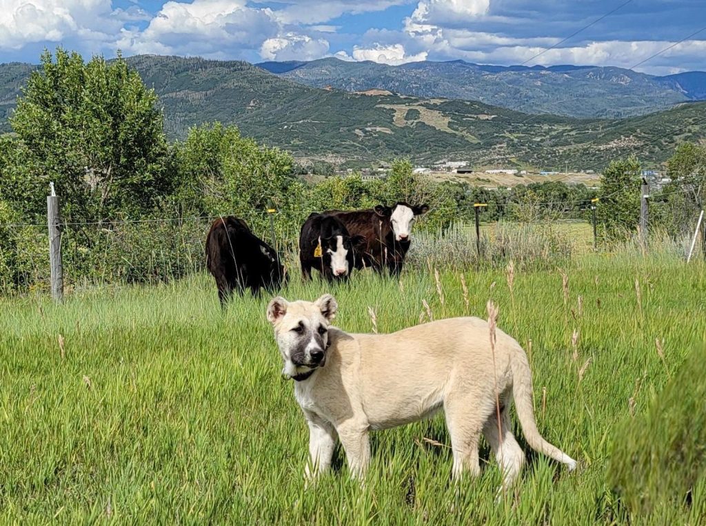 Nearby, in Steamboat Springs, Wild Ranch is working alongside Pat and Jan Stanko to pilot another idea. The Stankos run Emerald Mtn. Ranch, which not only raises cattle, poultry and sheep, but raises and trains livestock protection dogs. Starting in 2024, the couple became a supplier of Turkish boz shepherds through a USDA Wildlife Service’s program that matches Colorado producers to guardian dogs.