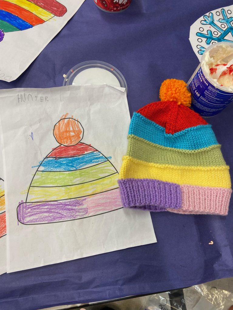 During the big reveal, the students were “super excited” to receive the knit manifestation of their hat drawings, Sunday said. “I think they were in shock that something they colored was real.”