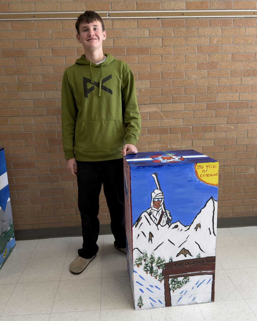 For the box that celebrated Colorado’s 150th, which took second place, Harper Rednor, Janson Zhang and Violet Rader painted symbols of Colorado — a bighorn sheep, columbines, mountain ranges and, of course, a Jolly Rancher. The students were excited to learn from their research about their home state that Jolly Rancher was founded in Colorado and that the candies were manufactured in Wheat Ridge up until 2002.