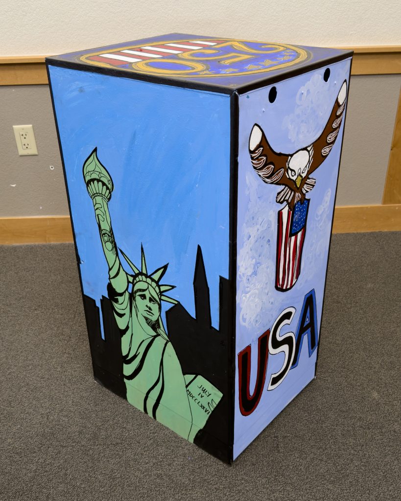 The winning box that is now displayed at the school, designed by Khandro Aungae, Zoe Barnes and Ferran Quiroga, pays tribute to the United States with panels displaying the Declaration of Independence, an astronaut on the moon, the Statue of Liberty, a soaring eagle and a crest celebrating the country’s 250th.