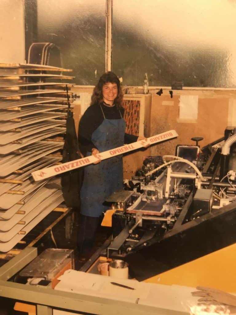 At first, the factory higher-ups made a ruling that Thoren couldn’t be in the factory until she learned to speak German. Little did they know that she had learned German while ski race training in Switzerland, so they had to let her in. The head of the factory still didn’t like it, and she wasn’t allowed to be there if he was there, so the workers, who grew to like Thoren and helped her learn how to run all the pieces of machinery involved in making skis, would give her a heads up if the head honcho was on the premises. If he was, Thoren would retreat to the dark room and work on graphics for the skis and not be discovered.