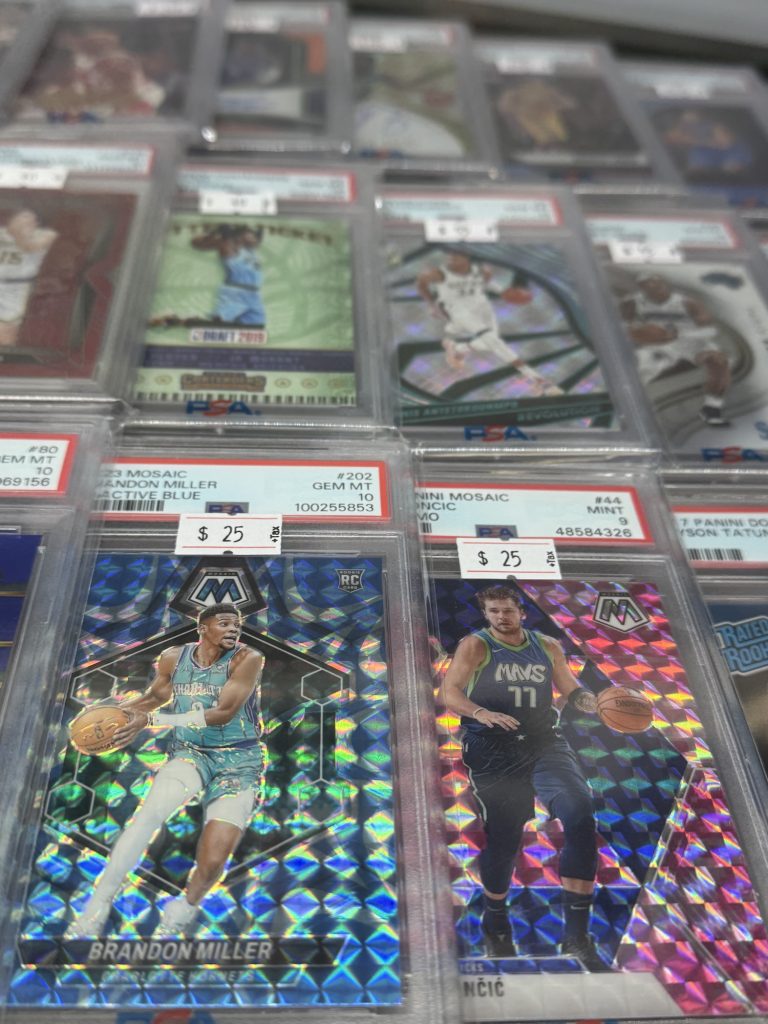 And it’s not just sports cards and memorabilia at Slab & Stitch. A display case full of Pokémon cards is also worth a gander. Both Monson and Daly reluctantly admit having Pokémon cards back in their middle school days, but Daly says giving away his Pokémon binder to some family friends is one of his biggest regrets in the hobby.