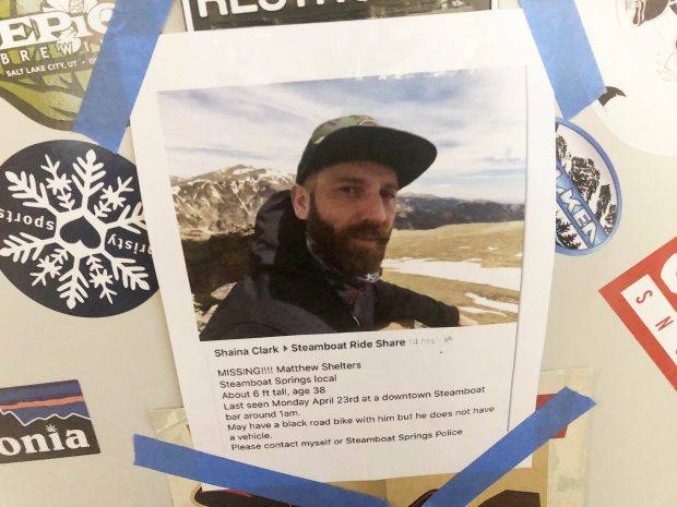 Posters advertising Matt Shelters’ disappearance have been distributed throughout town. Dozens of his friends have been searching Steamboat and the Yampa River.Matthew Shelters works at E3 Chophouse as a bartender. He has lived in Steamboat for about 12 years and was currently living at The Flour Mill apartments.