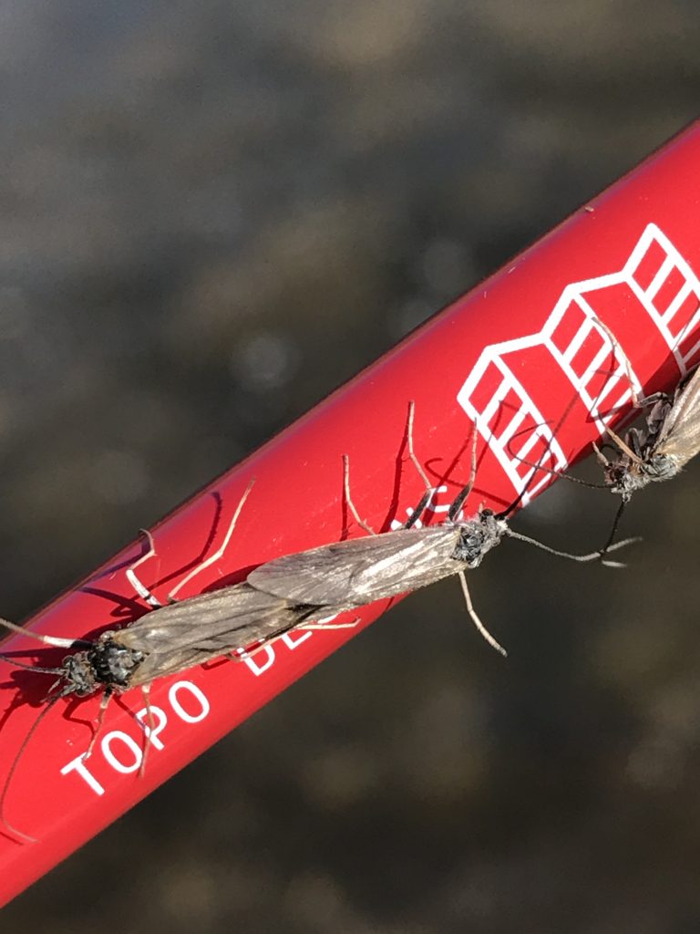 The bugs are already feeling the warmth. Singles and early emergers are bouncing around on shoreline grass and popping through the surface film on the river. Active bugs skitter, dive and swim. They bounce and dance on the surface when emerging.
